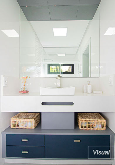 Mdf cinza e azul fosco com acabamento matte. Os puxadores cromados com cristais Swarovsky quebram a sobriedade do projeto.
