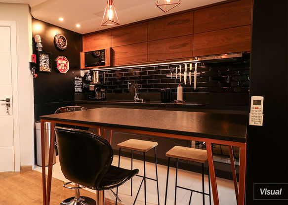 O Luxo máximo da marcenaria, a lâmina natural de nogueira em junção com a pintura Gofratto, mais conhecida como fórmica líquida ou micro textura, dá um ar de nobreza e sofisticação a esse projeto de linhas minimalistas.