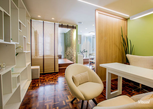 Este ambiente feito para uma clínica estética e spa, foi pensado para proporcionar conforto e harmonia. Para isso, as arquitetas Ane e Ivania elegeram materiais com texturas naturais como a madeira em tom mel, chapas marmorizadas, metais com pintura rosê, fios e cordas, e muita iluminação indireta. .