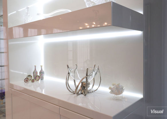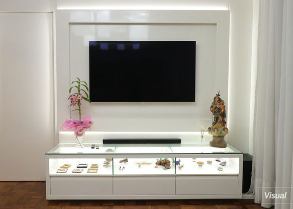 Uma verdadeira obra de arte em Mdf laqueado alto brilho perolizado polido. As molduras ganharam iluminação indireta com fita de led.